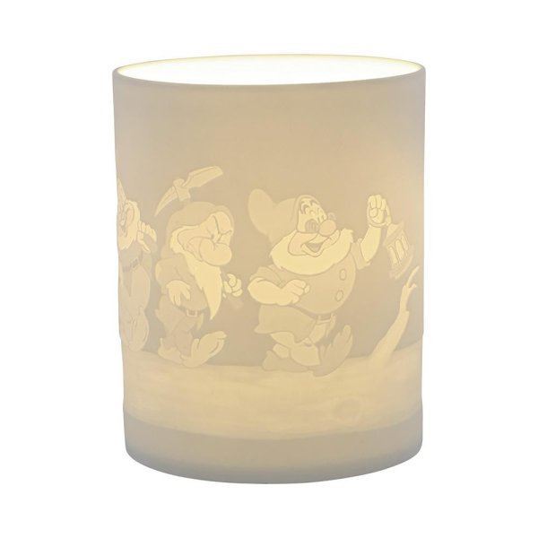 The Seven Dwarfs will seem as if they are returning home from work when you light the LED candle and they flicker across your room creating a warm night light. The Seven Dwarf characters from Disney's Snow White are etched into the thin translucent porcelain. Electric LED tealight candle and 3pcs LR44 batteries included. Tea light holder also suitable to use with a candle. The perfect gift for any Disney fan.