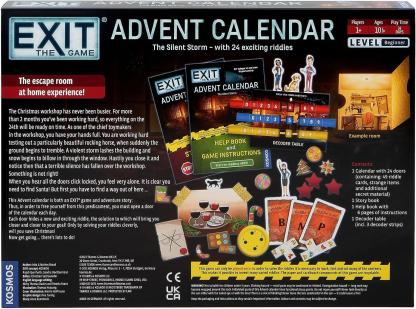 EXIT THE WORKSHOP – The Christmas workshop has never been busier! As one of the chief toymakers, you have your hands full. Suddenly a violent storm lashes the building and snow begins to billow in through the window. You close it, but something is not right! THE GREAT ESCAPE – All the doors click locked and you are all alone. You must find a way out of the locked workshop and find Santa and save Christmas! ADVENTURE TIME! – This advent calendar is both and Exit game and an adventure story. In order to free yourself from this predicament, you must open a door of the calendar each day. Behind each door you will find a new and exciting riddle, the solution to which will bring you closer and closer to escaping the cave ITS GAME TIME: The advent calendar includes 49 riddle cards, strange items and secret additional material, 1 story book, 1 help book with rule sheet, 3 decoding strips in the help book and 1 decoder table THAMES & KOSMOS: The EXIT Series is one of our many award-winning games; A series that allows you to bring the excitement, intensity, and team spirit of an escape room to the comfort of your living room; Feel the thrill of it all!