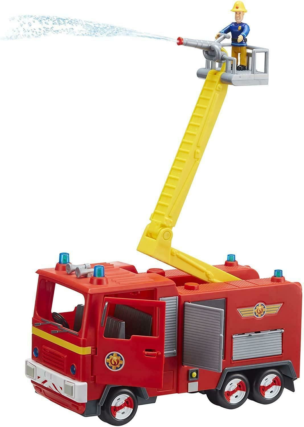 With lights, siren sounds & phrases! Real working water cannon! Free-whelling with poseable rescue crane. Includes articulated Fireman Sam figure. Open the firefighting equipment panels! Jupiter, Fireman Sam figure.