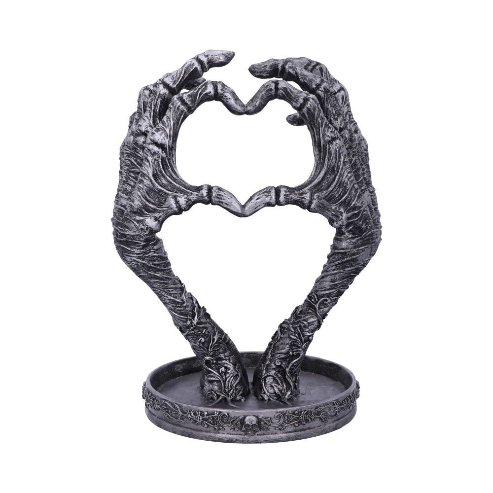 From the minds of their darkly Gothic creative team, this eerie jewellery holder is from alternative brand Nemesis Now's giftware collection. A pair of decomposing hands emerge from a small point, the raised edge decorated with small skulls and intricate floral designs. The painfully thin wrists of the creature are entwined with metallic vines while the skeletal fingers form the shape of a heart, making the most ideal place to hang your rings, necklaces and bracelets. This perfect amalgamation of when love and death embrace is cast in the finest resin before being lovingly hand-painted.