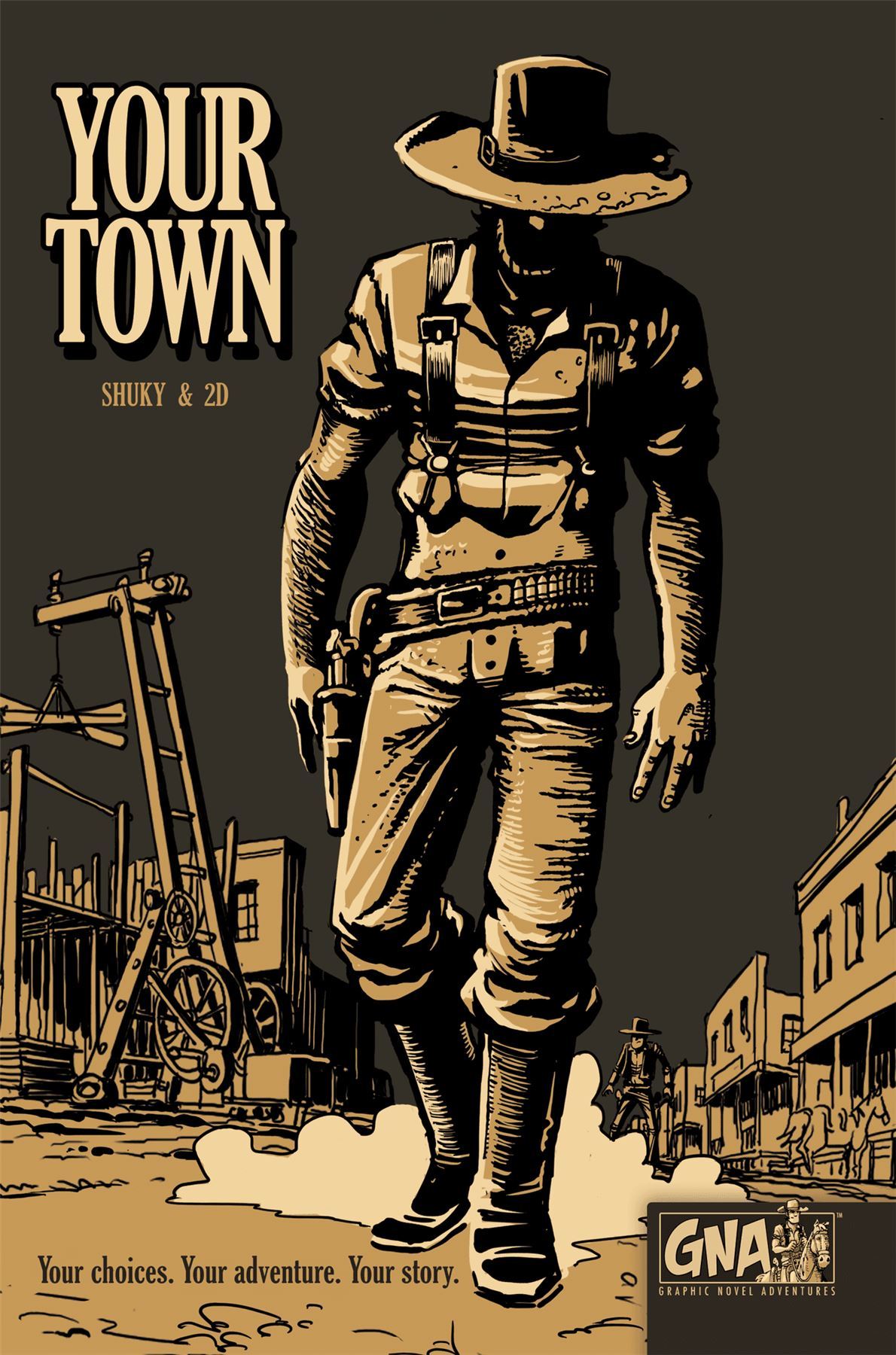 Lost in the middle of the vast American wild west, you arrive in the small town of Your Town. After going around, your decision is made: you will improve it and make it prosper. Build buildings, hire qualified staff, buy land, manage your finances, because the mayor of this city is you! Your Town is a comic combined with a game, one title in a series subtitled The comic in which you are the hero. You embody a character in an immersive story in which your choices guide your progress. You have a character sheet akin to those used in role-playing games that tracks your possessions, your special abilities, your coins, and your victory points. In general, gameplay consists in following the comic's panels -- which contain clues, riddles and traps -- and making choices about where to go and what to do, while using your visual perception to collect clues and be smart enough to resolve the riddles.