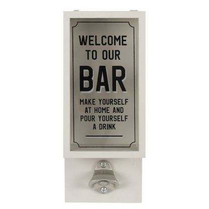Outdoor spaces are taking center stage this summer, so be prepared with unique garden decor. This MDF bottle opener plaque features a glass sliding front for holding stray bottle caps with 'Make yourself at home and pour yourself a drink' text and an atta