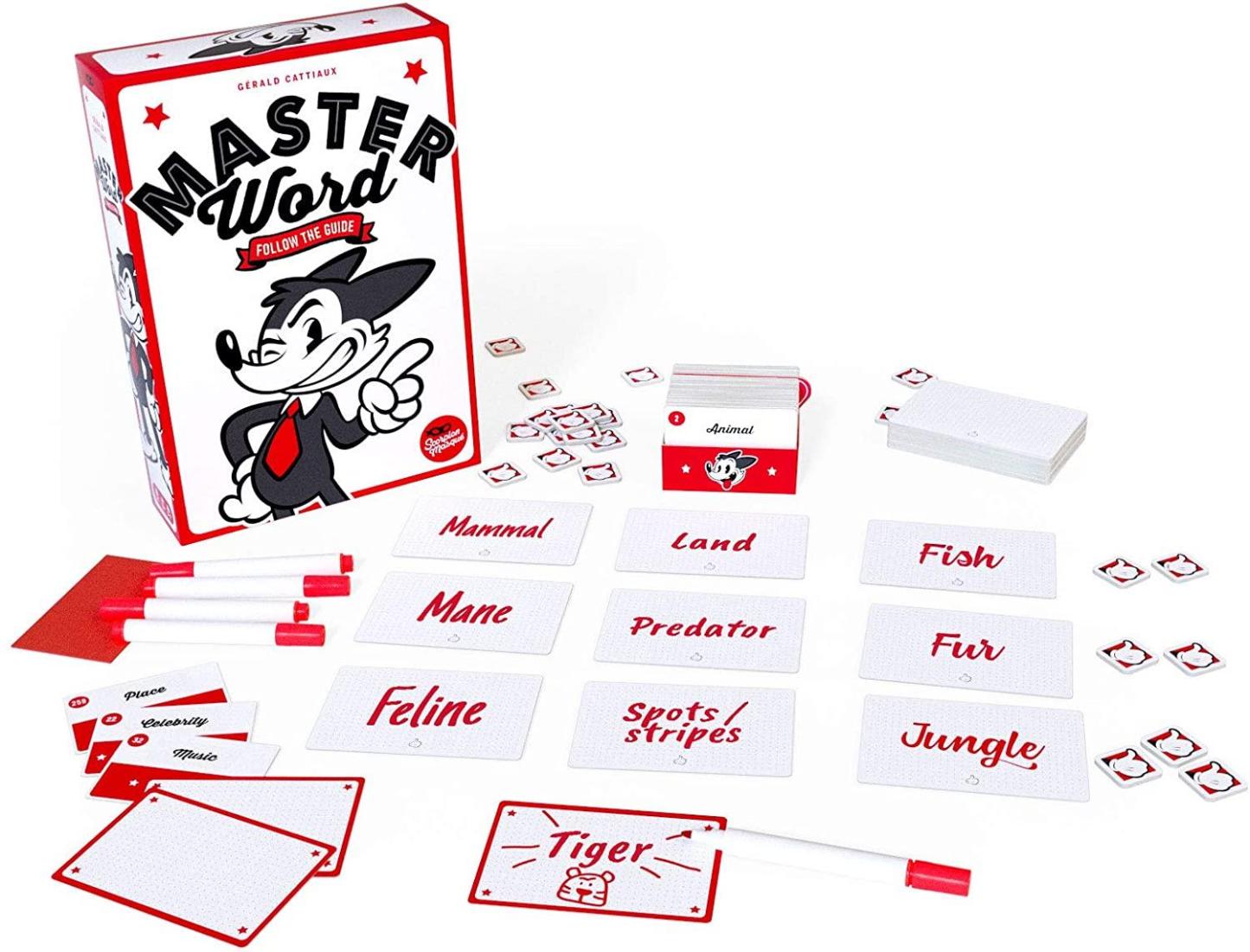 Are you as clever as a fox? As dogged as a bloodhound? Do you have an eagle-eye for details? Pool your team's resources together to seek out the Master Word! Master Word is a co-operative word-based deduction game where players have to work together to try to find a secret word from a single starting hint. Each game, a Guide selects a card, looks at the Master Word, then shows the other players (Seekers) the starting hint. The Seekers then have 90 seconds to discuss and each write a Clue on a card, which they place in a row. Once this is done, the Guide places a number of tokens at the end of the row equal to the number of Clues that are 'on the right track' toward the Master Word. The only catch: the Seekers don't know which Clues the tokens refer to! If the Seekers write the Master Word on a Solution Card before the end of 7 rounds, everyone wins! If they fail to do this, or if they accidentally write the Master Word on a Clue Card, everyone loses!
