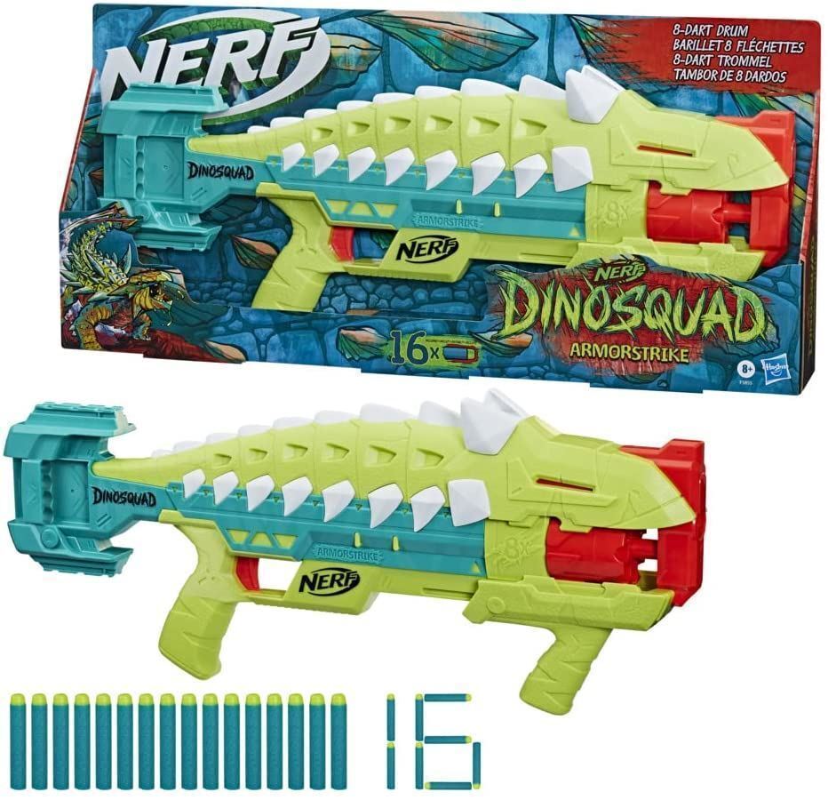 NERF DINOSQUAD ARMORSTRIKE BLASTER: Charge into action and adventure with this dart blaster that features awesome dinosaur details, capturing the look of an Anklyosaurus dinosaur. 8-DART ROTATING DRUM: Show your dino-power with this blaster that launches 8 Nerf Elite foam darts in a row from the rotating 8-dart drum. PUMP-ACTION DROP GRIP: Pump the drop grip backward and forward to prime the blaster and take advantage of the grip's below-the-barrel design to help you stabilize your aim. 16 NERF DARTS: Comes with 16 Official Nerf Elite foam darts, giving you 8 darts to fully load the drum and 8 darts to store on the blaster for reloads. DART STORAGE: There's onboard 8-dart storage, so you can keep backup darts nearby to reload the drum fast and keep on blasting.