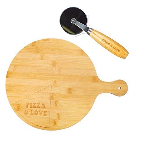 A kitchen must-have, this bamboo pizza board is engraved with a pizza slice design and quote which reads 'pizza and love'. Completed with a bamboo handle to make serving that little bit easier.
