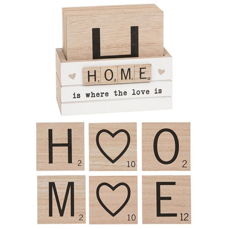 Made from natural wood, each coaster is printed with a unique letter that when placed together spells the word 'Home'. An added fun little feature is that the letter tiles also show their corresponding Scrabble letter points value. There are also two further coasters that each feature a love heart design. The 6 coasters are wonderfully presented in a small wooden holder that has a natural and distressed finish for a rustic appearance. The front of the holder features mini scrabble tiles that again spell the word 'Home' along with printed text that together reads 'Home Is Where The Love Is'. This fabulous coaster set is ideal for protecting your table surfaces from drinks