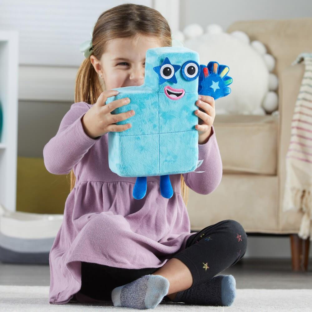 NUMBERBLOCKS AS SEEN ON TV: Five is a real star and the lead singer in the band. Count on this snuggly plush toy to get the counting party started with lots of singing, counting and number fun in Numberland. SOFT LIGHT-UP HAND: Press the star on her High Five Hand and count along with Five as each of her fingers lights up - 1 glows red, 2 is orange, 3 is yellow, 4 glows green, and 5 is blue – just like her Numberblocks Friends. HEAR FIVE SING: Five sings the Numberblocks theme song, just like in the episodes. Listen or sing along as she shares 12 phrases and songs. SOFT TOY: Made from super-soft plush fabric and stuffed with high quality foam to keep its block shape, Numberblock Five is an interactive toy that’s ready for cuddles, snuggles, and sensory play. INCLUDES: Sing-Along Numberblock Five with 3 AAA batteries which are replaceable. Five measures approx. 28cm W x 27cm H.