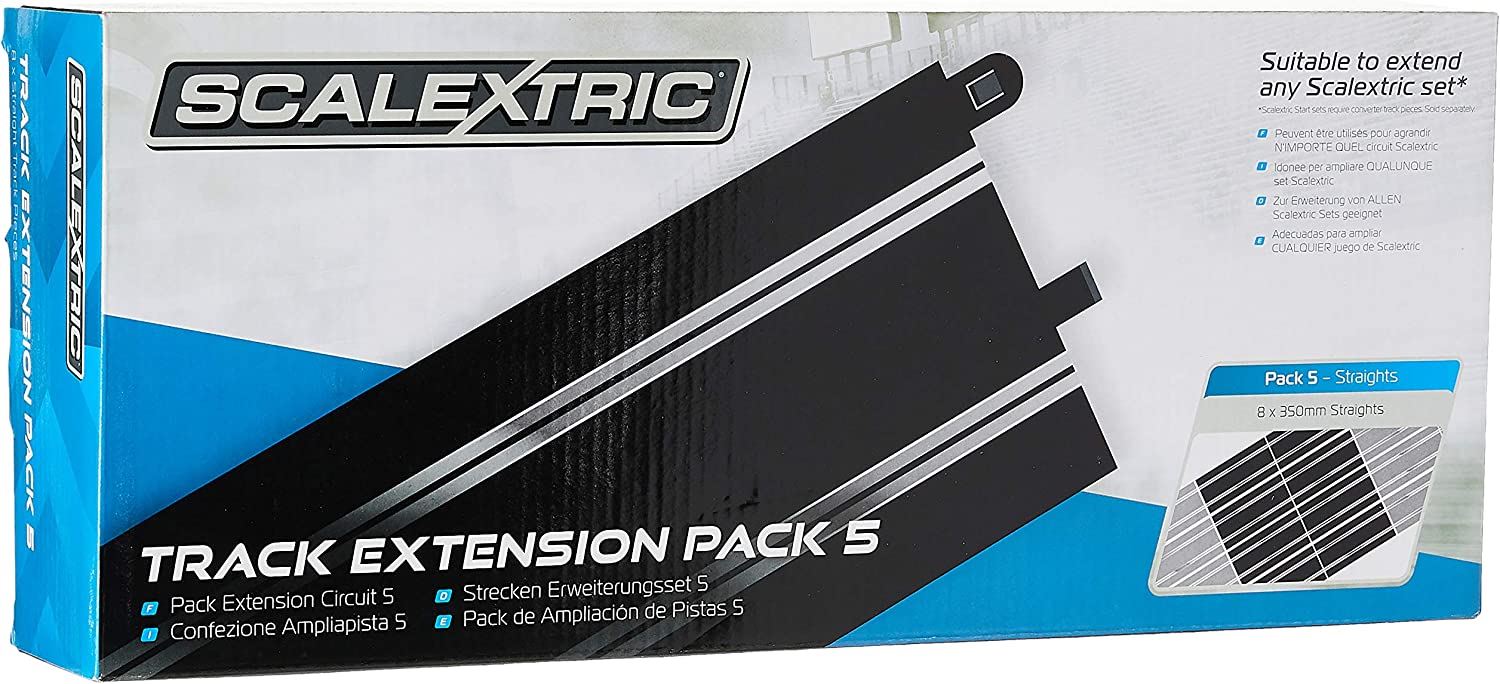 One size fits all' concept. Compatible with Digital and Standard sets. Extending your Scalextric layout has never been easier. The seven Scalextric Track Extension Packs are totally flexible in their design and any of these packs can be added to both Standard or Digital Scalextric circuits. Each pack can be incorporated into a Scalextric circuit, from simple ovals and figure-of-eight tracks to the largest layouts. Contents: 8 x 350mm Straights.