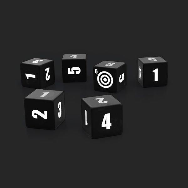A set of 10 engraved Base Dice, made specifically for The Walking Dead Universe Roleplaying Game. These 16 mm special dice are designed to support the game mechanics but can be used as normal six-sided dice as well.