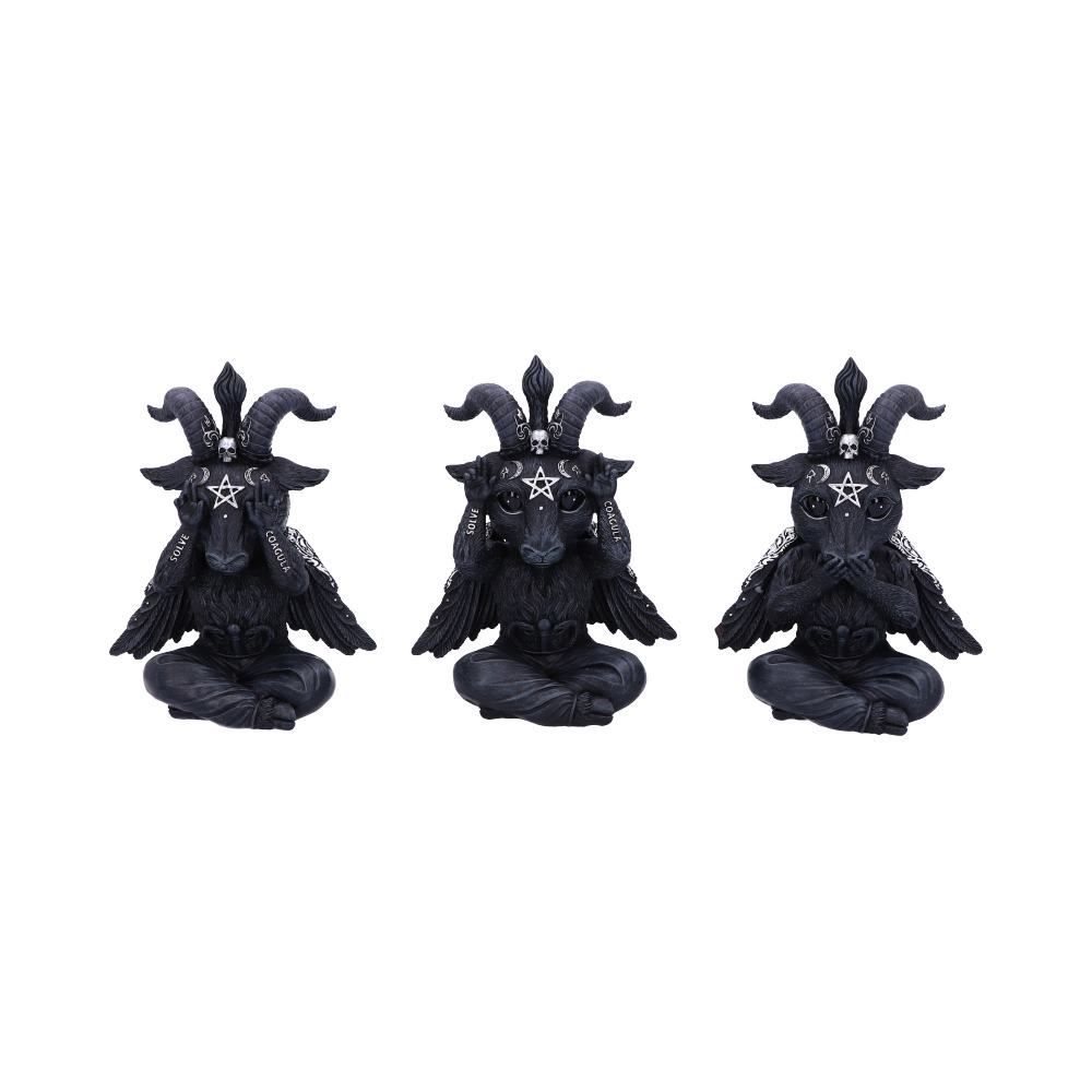 These Three Wise Baphomet figures sit side by side, one covering their mouth, one their eyes and one their ears. These goat-headed hermaphrodites bare the Latin words SOLVE and COAGULA. Worshipped by occultists from Jacques de Molay????s Templars to Alistair Crowley, Baphomet has long been a symbol of free-thinking heresy and forbidden knowledge. Cast in high-quality resin before being expertly hand-painted these Three Wise Baphomet are perfect for any spiritual lover.