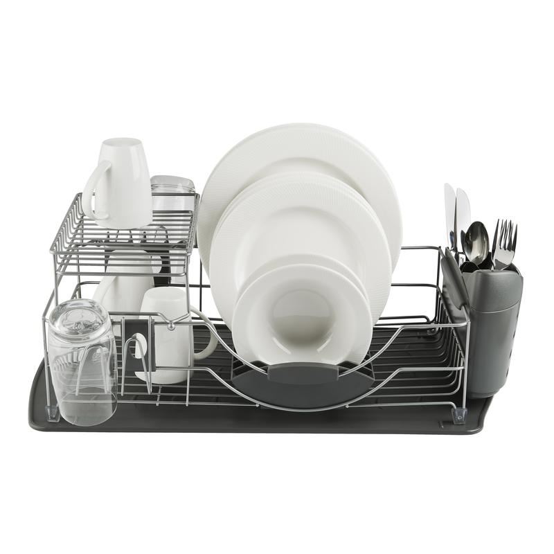 Make the most of your worktop space by combining both quality and style with this compact 2-tier dish rack. Formed from a durable colour coated steel frame that prevents the cause of unwanted scratching and corrosion and provides a sleek finishing touch. Its compact design does not compromise on drying space, accommodating up to 12 plates at any one time, with separate space across 2 tiers for your glasses and mugs to be drained. The draining tray's raised ribs keep your items elevated during drying, so excess water can be drained away easily. Designed for ease of unloading your items as well as cleaning, both the draining tray and cutlery holder are fully detachable for the added benefit of a compact and tidy storage.