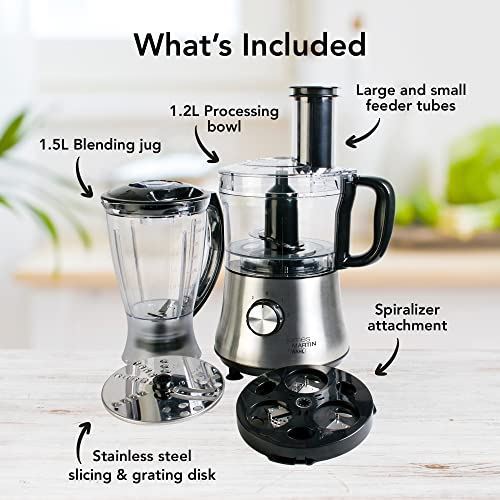 This versatile, 500W Compact Processor is simple to use and easy to clean. It includes a processor bowl with the stainless steel blade, a disc for slicing and grating as well as a spiralizer attachment. The large and small feeder chutes make it perfect. With 3 pin UK plug.
