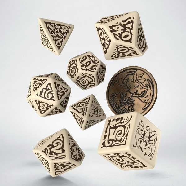 An unnerving cawing. Tremble at the sight of this dice set inspired by The Witcher franchise, and dedicated to the leshen � a powerful monster often accompanied by a swarm of crows. The set contains 7 dice and a metal coin. Each dice is painted beige with brown engravings. The highest value faces and the coin reverse share imagery with the leshen's horned skull; the crows rule over the obverse.