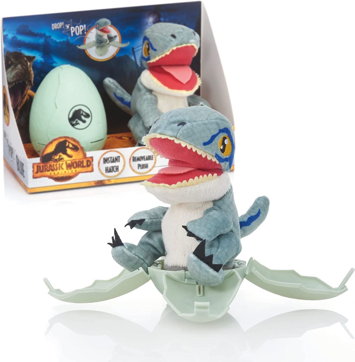 Epic Instant hatching Dinosaur Toy - See your favourite dinosaurs instantly hatch, simply drop and watch in amazement as a Blue Velociraptor Dinosaur from the Jurassic World Franchise springs out. Be careful it doesn't bite! Drop to Pop and reveal - Play