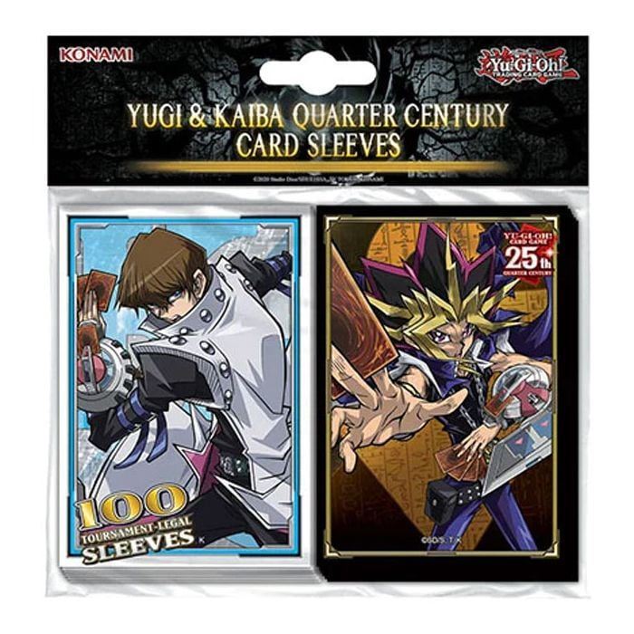 The Official Yu-Gi-Oh! TRADING CARD GAME (TCG) Yugi & Kaiba Quarter Century TCG Card Sleeves help Duelists keep their cards secure and protected during Duels. Protect the cards in your Deck with Card Sleeves featuring brand-new dynamic artwork of Yami Yugi and Seto Kaiba with a bold Quarter Century logo! This special release comes with 50 Card Sleeves of each design so you can choose to play as heroic Yami Yugi or merciless Seto Kaiba! Each pack contains 100 total Card Sleeves (50 featuring Yami Yugi and 50 featuring Seto Kaiba) specifically designed to meet tournament regulation standards for the Yu-Gi-Oh! TCG. Features: ??Each pack contains 100 Card Sleeves specifically designed to meet tournament regulation standards for the Yu-Gi-Oh! TCG. ??Keeps your cards safe and protected, easy to shuffle. ??Acid free and archival safe. Contents: ??100 x Yu-Gi-Oh! Card Sleeves
